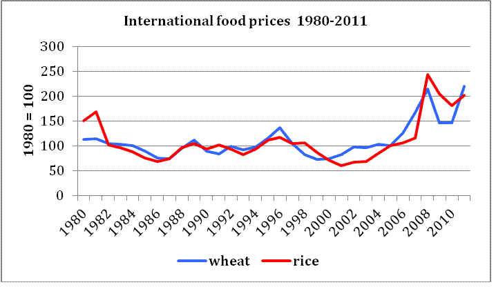 Added to these long standing causes of potential unrest were two new elements. The first was increasing food prices that seriously affected the poor of the region. Figure 1 illustrates the international prices of wheat and rice, both key food staples in the region. The steady rise that occurred after 2001 resumed after the global recession reduced the prices in 2008-9.