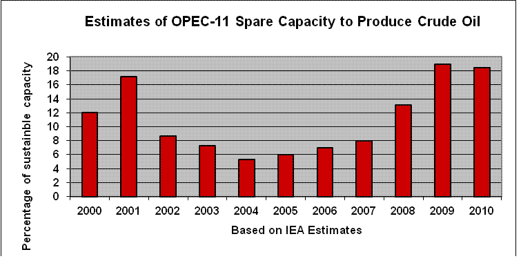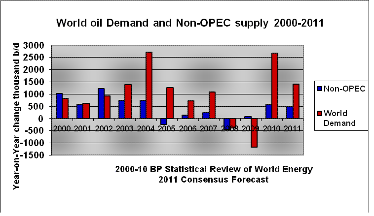 Figure 3 outlines the development of world oil demand and non-OPEC supply since 2000. As can be seen, since the global economic recession reduced oil demand growth in 2008 and 2009, 2010 appears to have been an extremely strong year for growth, dominated by the increased demand from the Middle East and Asia. At the same time since 2004, Non-OPEC production growth has been either negative or very low.