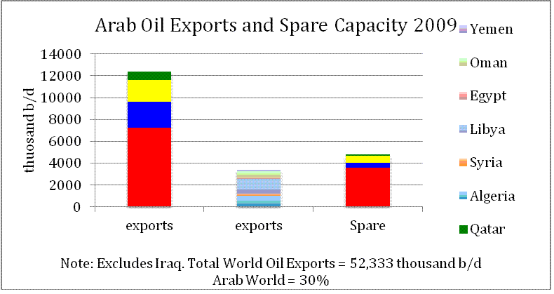 This pattern of demand growth and non-OPEC production is translated into the level of spare capacity to produce crude oil, which is shown in figure 4. This is an estimate of capacity, which can very quickly be brought into production i.e. within a matter of days. As can be seen, in 2010, spare capacity was at quite high levels relatively. As for the patterns of oil exports from the Arab Countries excluding Iraq [16] , this can be seen in Figure 5 for 2009.