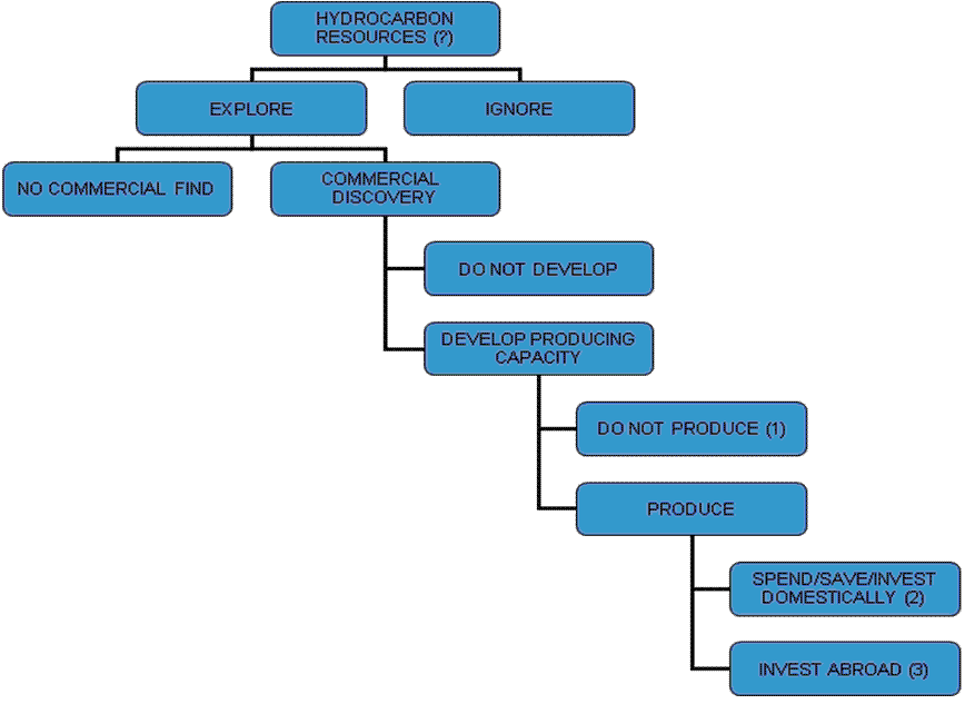The first choice (1 in Figure 9) is whether to produce the oil now or later. If production is postponed, this choice earns a rate of return which will be positive if the future rent [27] from the barrel is higher than today either because oil prices have risen and/or production costs have fallen. If the oil is produced today, then the choices are either to invest the revenue domestically (2 in Figure 9) or invest it abroad (3 in Figure 9) through some form of oil fund [28] . Investing domestically will earn a rate of return although how much will be a function of the government's ability to use the revenue productively and wisely and avoid attacks of "resource curse" [29] . Investing abroad also earns a rate of return although how much will be a function of how well the fund and its portfolio is managed, the state of international financial markets and whether the assets are secured from political interference from other governments who may control their investment context.