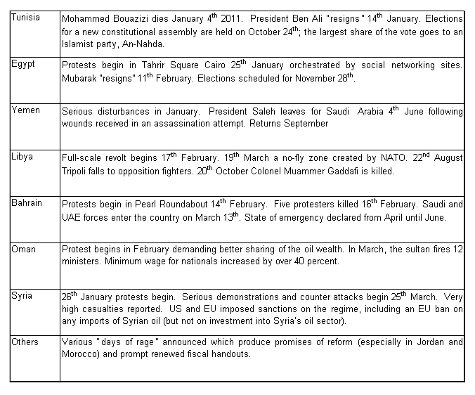 Table 1 present a rough chronology of events in the region although it must be stressed that in many cases these events are unfolding as this report is being written. The causes of these events are complex and generalizations about the Arab World are extremely dangerous. However, some attempt at explanation is required given the focus of this paper is the implications for the oil market and these implications are linked into the context in which the events are unfolding.