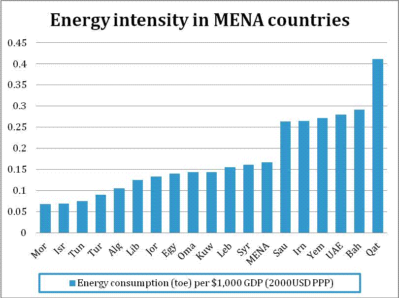 Taken as a whole, the MENA region is characterized by high levels of energy consumption per capita and energy intensity per unit of GDP. However the situation of individual countries differs markedly: the Maghreb countries (Morocco, Algeria, Tunisia) display relatively low energy intensity, while and the Gulf countries (including Iran and Yemen) register very high values. (Figure 1 below)