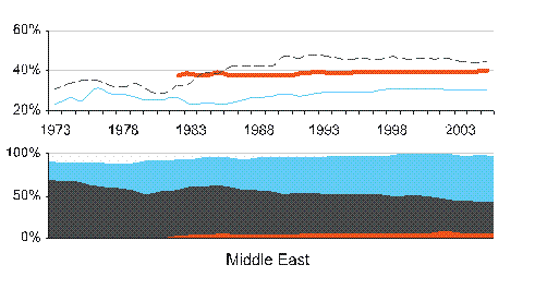 In a recent article [2] Maruyama and Eckelman have compared the energy efficiency of power generation across regions and years. (see Figure next page). In the Middle East the main primary source for power generation is gas, which has been playing a growing role relative to petroleum. Normally, the efficiency of natural gas plants is higher than with other fossil fuels, thanks to the combined cycle technology. However, in the Middle East oil fired power plants appear to be more efficient.