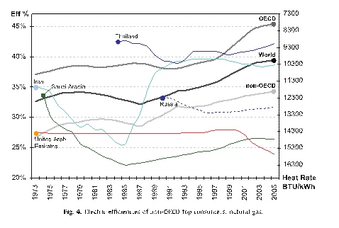 The efficiency of electricity production in Iran, Saudi Arabia and the UAE also displays some wide fluctuations, which the article has no explanation for. In the case of Iran, the decline until 1985 and major recovery thereafter is probably due to the Iraq-Iran war. As for Saudi Arabia and the UAE, lower energy efficiency is probably due to the fact that several gas plants are used for meeting seasonal peak demand: these are open-cycle gas turbines rather than combined-cycle. Also, gas is used in plants that combine power generation and water desalination. The combined production of power and desalinated water in MSF plants is in fact much more energy-efficient that having separate plants; but if the plant is considered only for power generation, it will appear to be inefficient.
