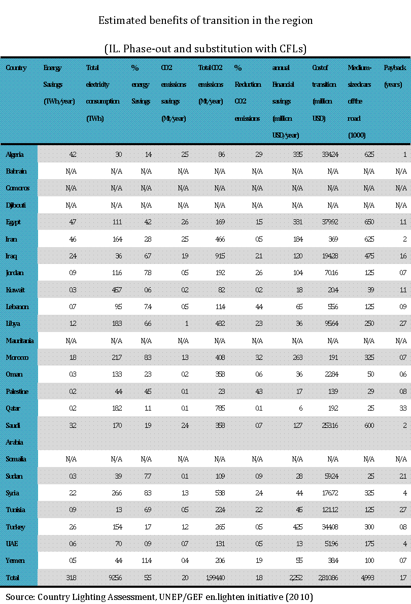 Curbing consumption for lighting through the substitution of incandescent light bulbs with other, more efficient forms of lighting is an approach that has attracted a lot of attention. It is a popular approach in the OECD countries, where incandescent light bulbs either have been or are in the process of being withdrawn from the market (but in the US a repeal of the relevant legislation is possible). In the MENA region, three countries have announced target dates for the phase-out of incandescent light bulbs: Lebanon (2012), Tunisia (2013) and Egypt (2020). Others may follow.