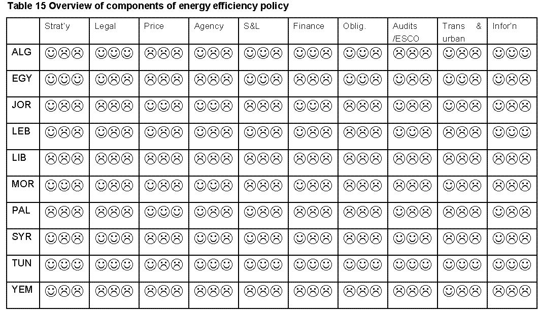 It is not easy to summarize policies for energy efficiency, because they are by nature complex and articulated. I shall refer to a "smiley" table recently proposed in a report [6] published by the Regional Center for Renewable Energy and Energy Efficiency (RCREEE), which is an independent organization established in Cairo with funding from the European Commission and two EU member countries, Germany and Denmark. The Center has 10 founding member countries (Algeria, Egypt, Jordan, Lebanon, Libya, Morocco, Palestine, Syria, Tunisia, and Yemen), while the Sudan, Iraq and Bahrain became members in October 2011. The Center has published national and regional reports covering its member countries - hence not all of MENA's countries.